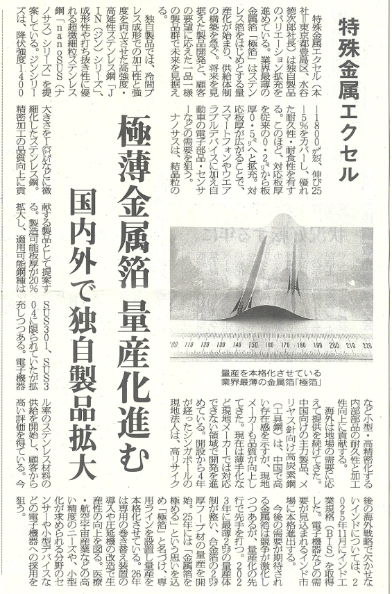 2026年1月19日付の日刊 産業新聞にて、弊社の「極薄金属箔 量産化進む」についての記事が掲載されました。ぜひ下記よりご覧ください。