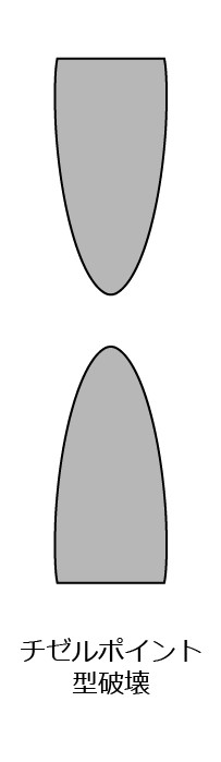破断部がのみ(Chisel)の刃型のようにみえることから、このように呼ばれています。 チゼルポイント型破壊の破面を電子顕微鏡などで観察するとうねった縞状の模様をした破面、または無特徴の破面がみられるのが特徴です。